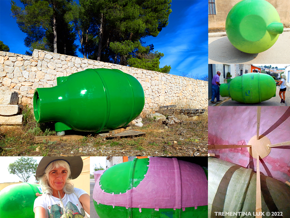 Y entonces la chica va allí, y detrás de ese muro de piedra seca se encuentra una figura gigante de color verde no identificada que se parece mucho al FALLIRUMA soñado, y deja la bici en el camino como en Verano Azul y se lanza cuesta abajo dando saltos entre las jaras y las verbenas hasta llegar a ese maravilla de ballena verde varada en mitad del monte, donde anidan las avispas y crecen los romeros, sin que nadie advierta su presencia.